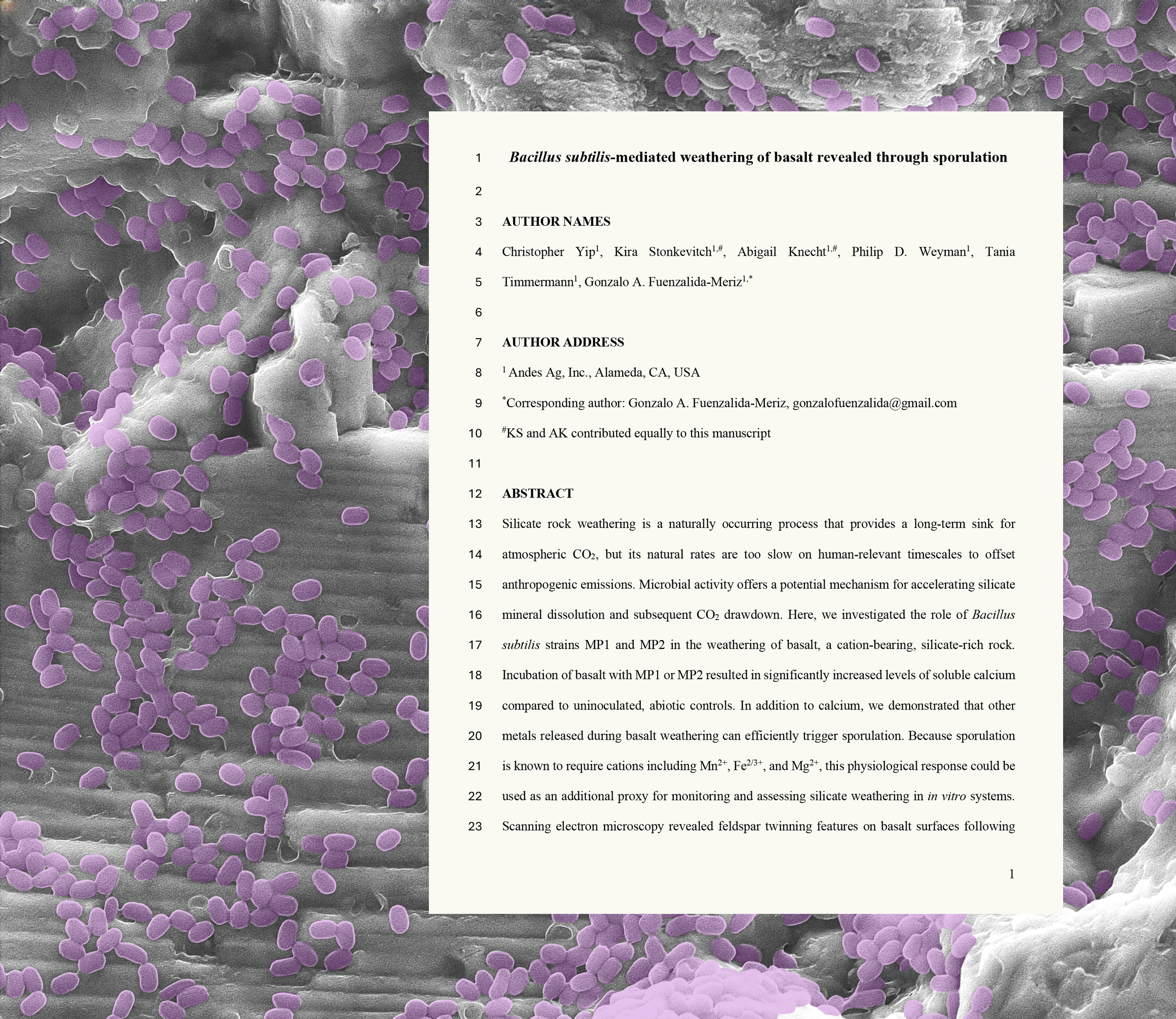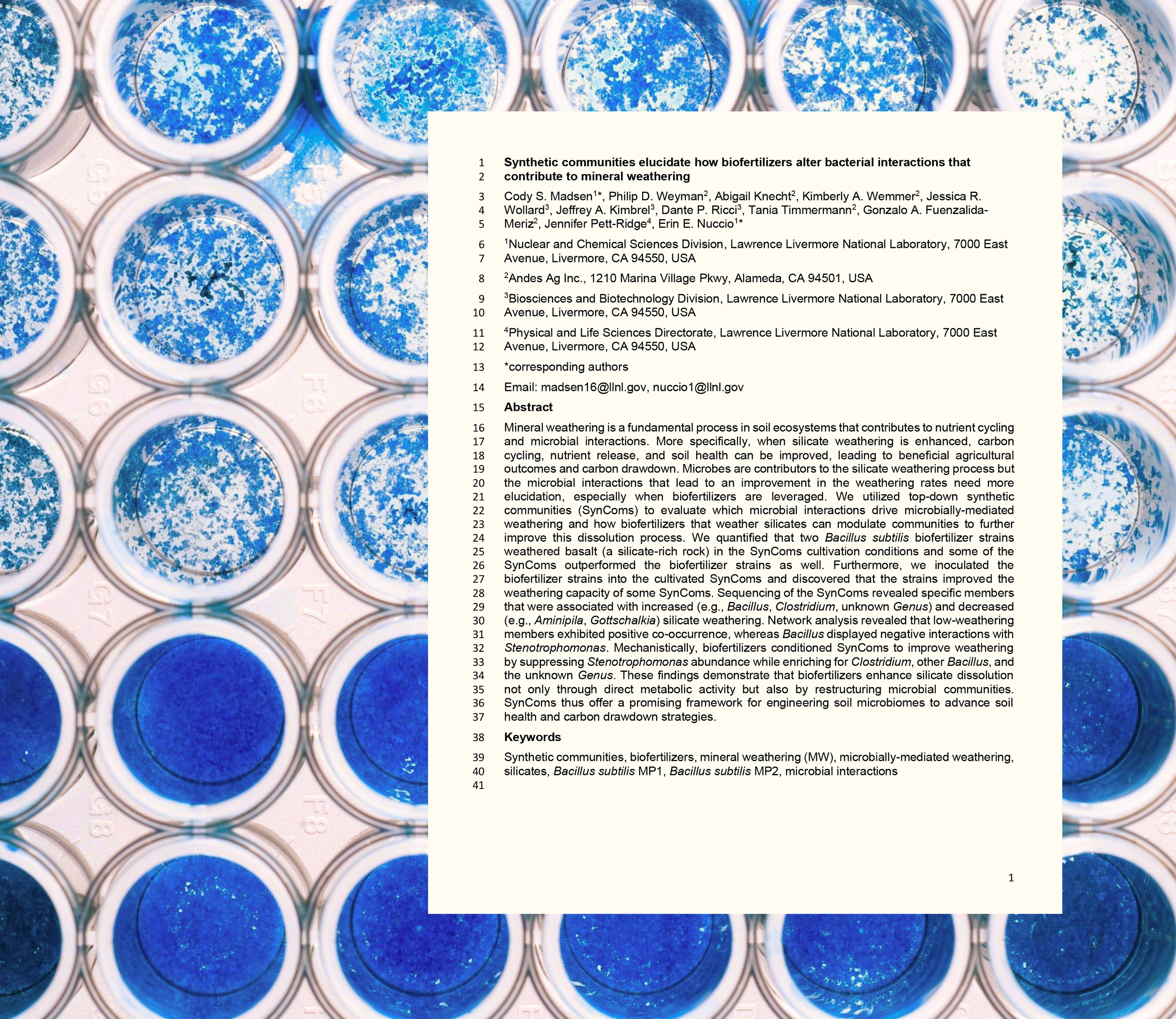 This study, performed by scientists from Lawrence Livermore National Laboratory (LLNL) in partnership with Andes, leverages top-down synthetic communities (SynComs) to disentangle the complex microbial interactions that drive silicate mineral weathering. Led by Dr. Cody Madsen (LLNL), the research demonstrates how Andes’ microbial amendment strains (Bacillus subtilis MP1 and MP2) not only weather minerals directly but also restructure native microbial communities to enhance dissolution rates. By identifying specific bacterial genera associated with improved weathering, this work establishes a framework for engineering soil microbiomes to advance soil health and carbon drawdown strategies.