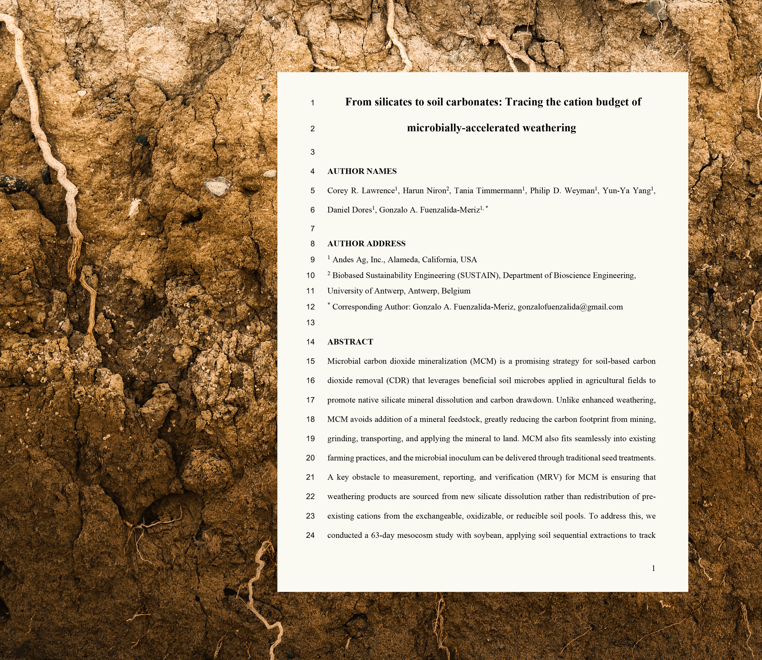 Led by Andes’ CTO and Co-Founder, Dr. Tania Timmermann, this foundational paper validates our core carbon dioxide removal (CDR) technology. Through a comprehensive suite of in vitro assays, mesocosm studies, and field trials, we demonstrate how Andes’ beneficial microorganisms accelerate the weathering of native soil silicates. The result is measurable, permanent carbon dioxide removal that integrates seamlessly into existing agricultural systems.