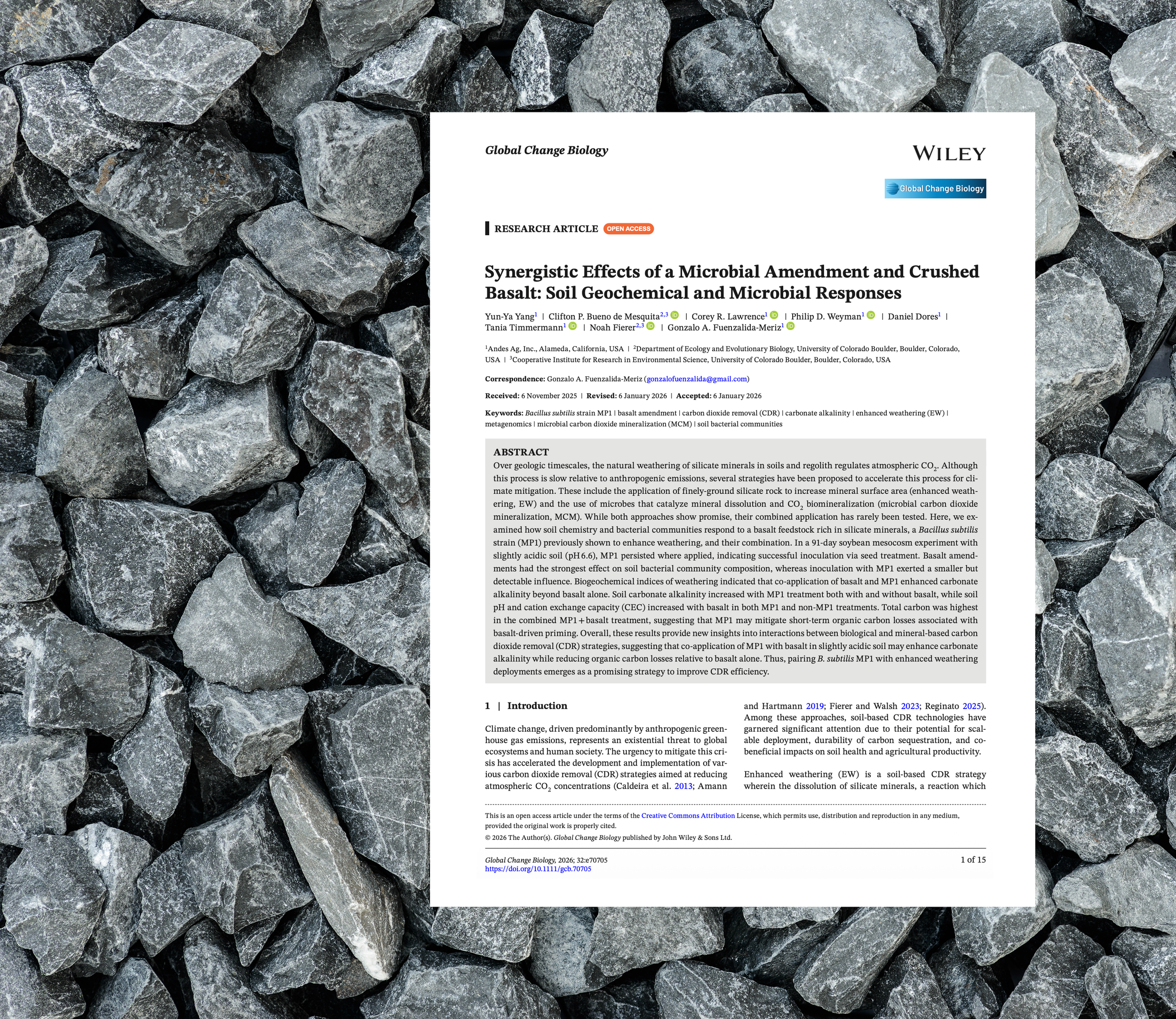 This study explores the powerful synergy between biology and geology. It investigates how co-applying Andes’ proprietary microbial strain (MP1) with crushed basalt significantly enhances carbonate alkalinity while preserving soil organic carbon. Conducted in a soybean mesocosm system, this research is a critical step toward developing scalable, hybrid Carbon Dioxide Removal (CDR) strategies that integrate soil microbiology with enhanced rock weathering.